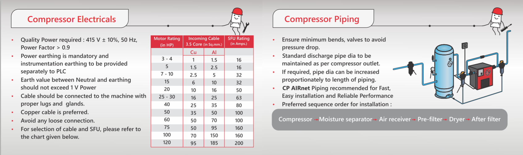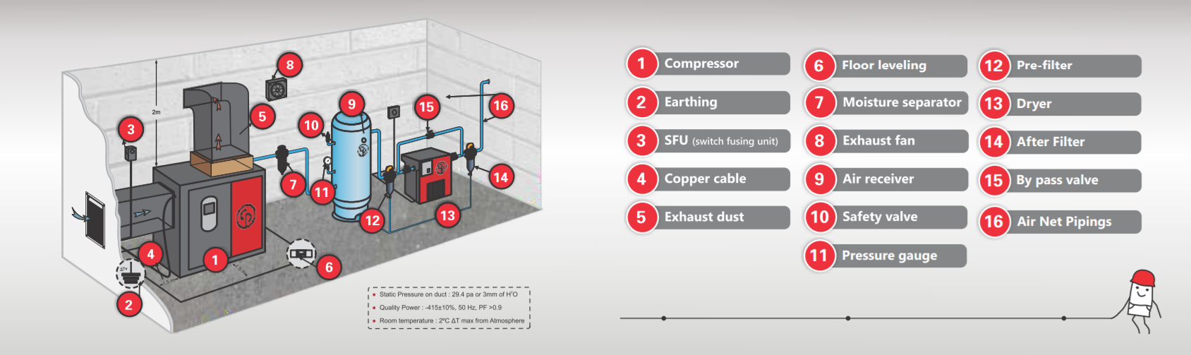 Chicago Pneumatic Installation & Maintenance Guidelines is a quick guide on how to design your compressor room or workplace. This helps you to prepare for installation of a compressor even before the unit has arrived at your site. The unit is ready to be installed and commissioned the moment it arrives at your site. No modifications will be required as you would have already taken into consideration all factors while designing the compressor workplace.